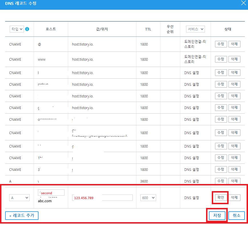 한 칸이 새롭게 추가될 것입니다. 타입은 A로 선택 후 호스트 입력칸에는 만들고 싶은 하위 도메인명을 입력합니다. 저는 second로 입력했습니다. 그러면 하위 도메인이 생성된 것입니다. 바로 second.abc.com입니다. 이 하위 도메인 주소를 기억해야 합니다. 메모장에 기록해 둡니다.