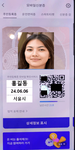 다섯 번째, 모바일 주민등록증 발급이 완료되었습니다. 기본화면은 자신의 얼굴과 이름, 생년월일, 주소입니다. 그리고 QR코드가 나타납니다. 하단에 상세 보기 버튼을 누르면 나머지 전체 정보가 나타납니다.
