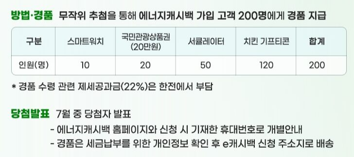 한전(한국전력공사 0에서는 100만 세대 가입 축하 이벤트를 실시합니다. 총 1,000만 원 상당의 경품을 지급할 예정입니다. 에너지 캐시백을 신청한 세대 중에서 총 200명을 추첨하여 경품을 지급합니다.