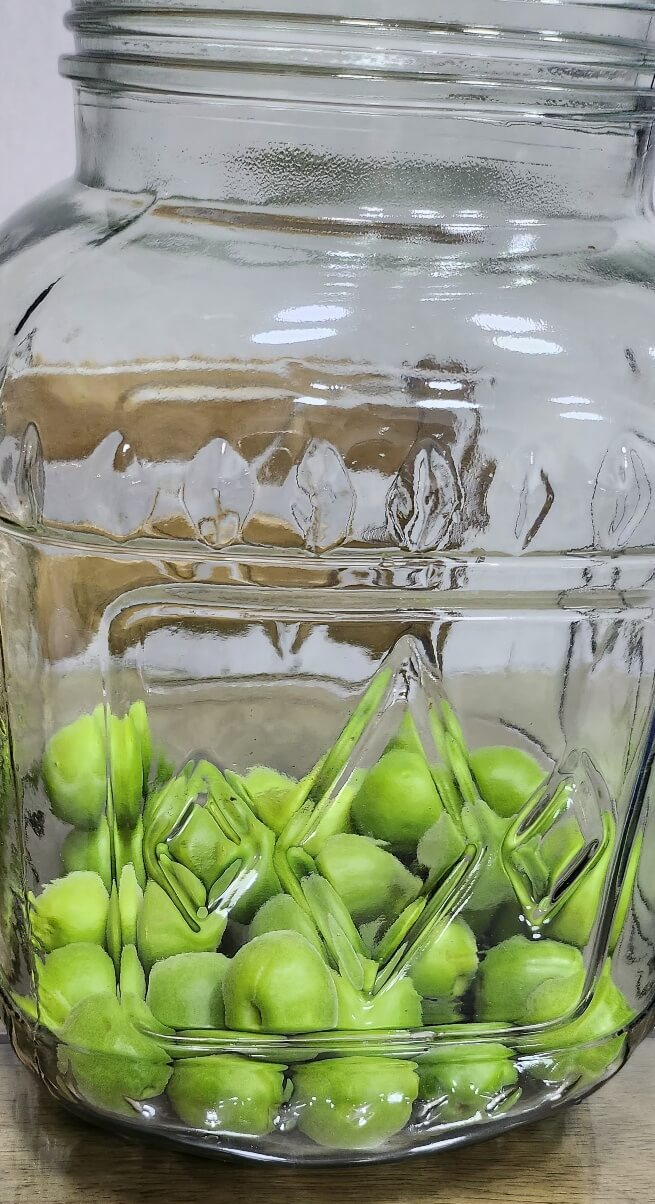 (5) 열이 식은 담근주 병 안에 매실을 1겹 정도