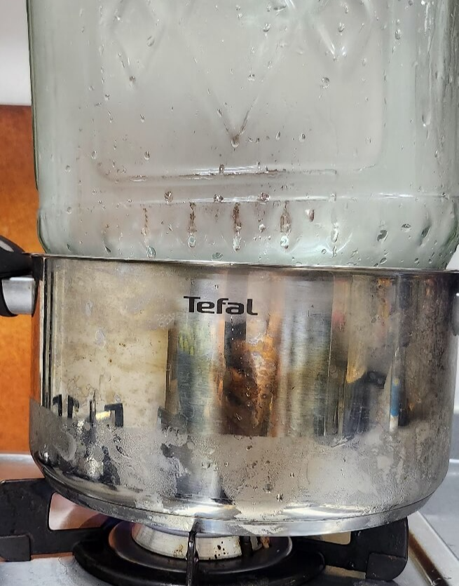 - 가스불을 켜고 물이 끓어 담근주병에 스팀이
