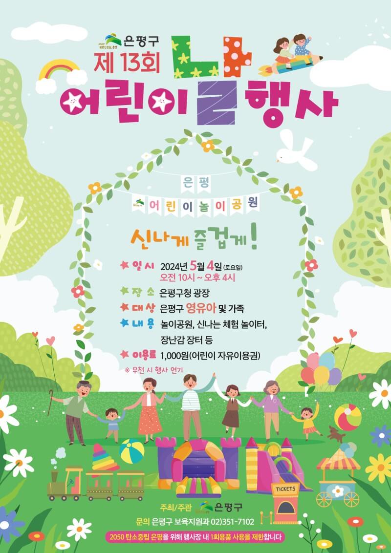 102주년 어린이날을 기념해 은평구 영유아 어린이들에게 야외에서 신나게 놀고 체험할 수 있는 기회를 제공하고자 어린이날 행사를 진행합니다. 은평구청 광장이 놀이공원이 되는 단 하루, 은평구 어린이들 모두 모여 신나게! 즐겁게! 놀아봅시다