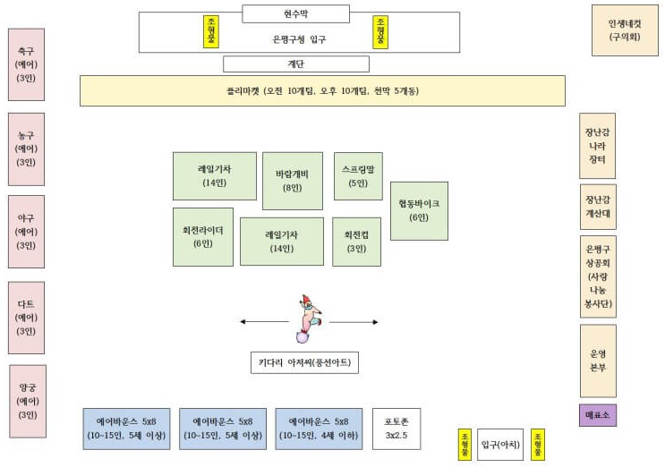 에어바운스, 레일기차, 회전라이더, 에어스포츠(축구, 야구, 농구, 양궁, 다트), 장난감나라 장난감 판매, 플리마켓, 6인 협동바이크, 회전컵, 바람개비, 스프핑 - 입장료: 자유이용권 단돈 1,000원(손목밴드로 예쁘게~)